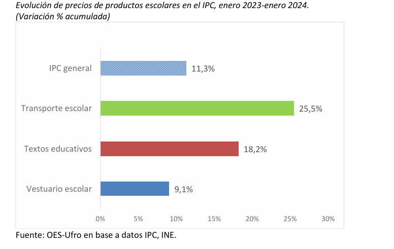 El informe también muestra que los textos educativos acumulan un alza de 18,2% en el mismo período, mientras que el vestuario escolar ha tenido un aumento más moderado, de 9,1%, incluso por debajo de la inflación general.