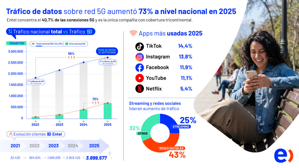 El crecimiento en el uso del 5G, se debe al aumento que ha tenido en general el tráfico de datos y en el desarrollo de esta red en los últimos años, donde Entel ya está cerca de los cuatro millones de clientes conectados a 5G. Además, anualmente, la compañía invierte cerca de USD 200 millones para mejorar la capacidad, cobertura, y la modernización progresiva de sus redes hacia las tecnologías más modernas, como 4G y 5G. Según datos de la Subsecretaría de Telecomunicaciones (Subtel) Entel lidera con un 40,7% de conexiones de sus usuarios en esta red en todo Chile.
